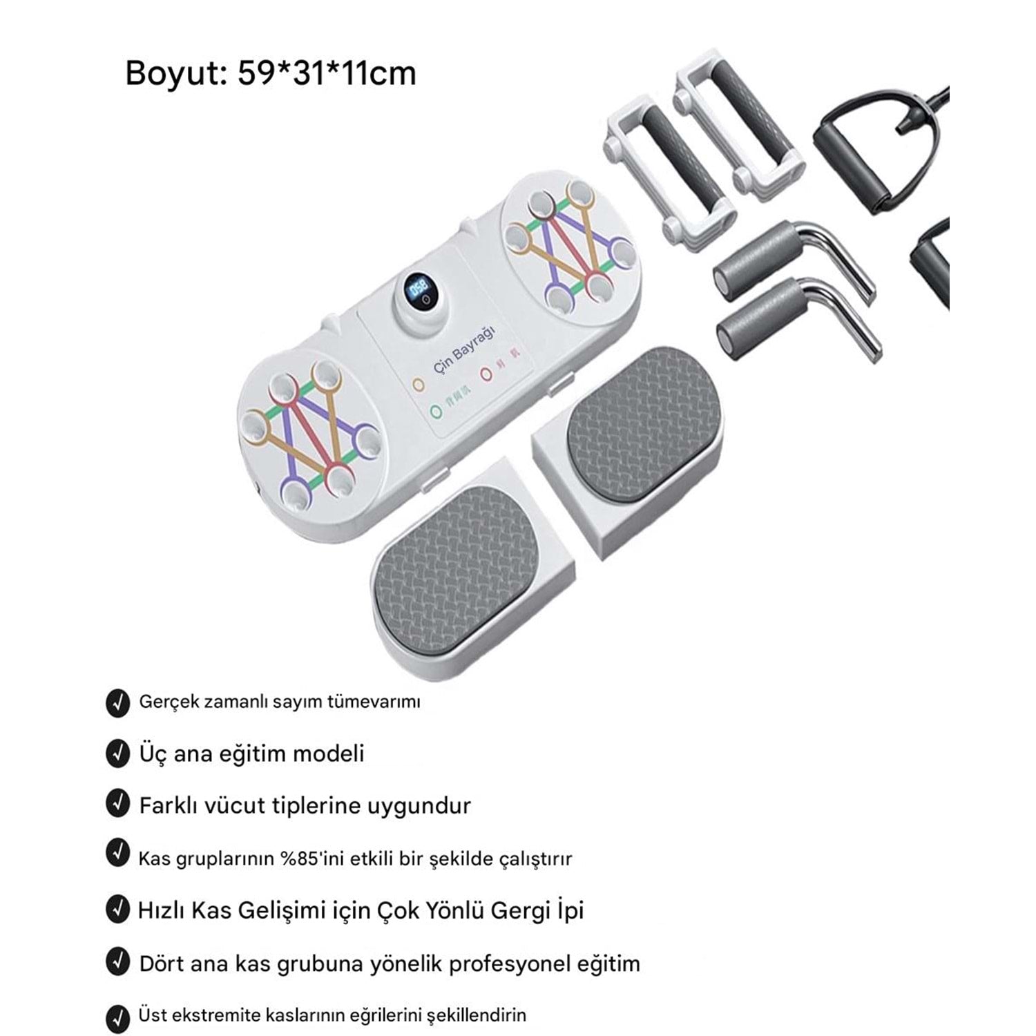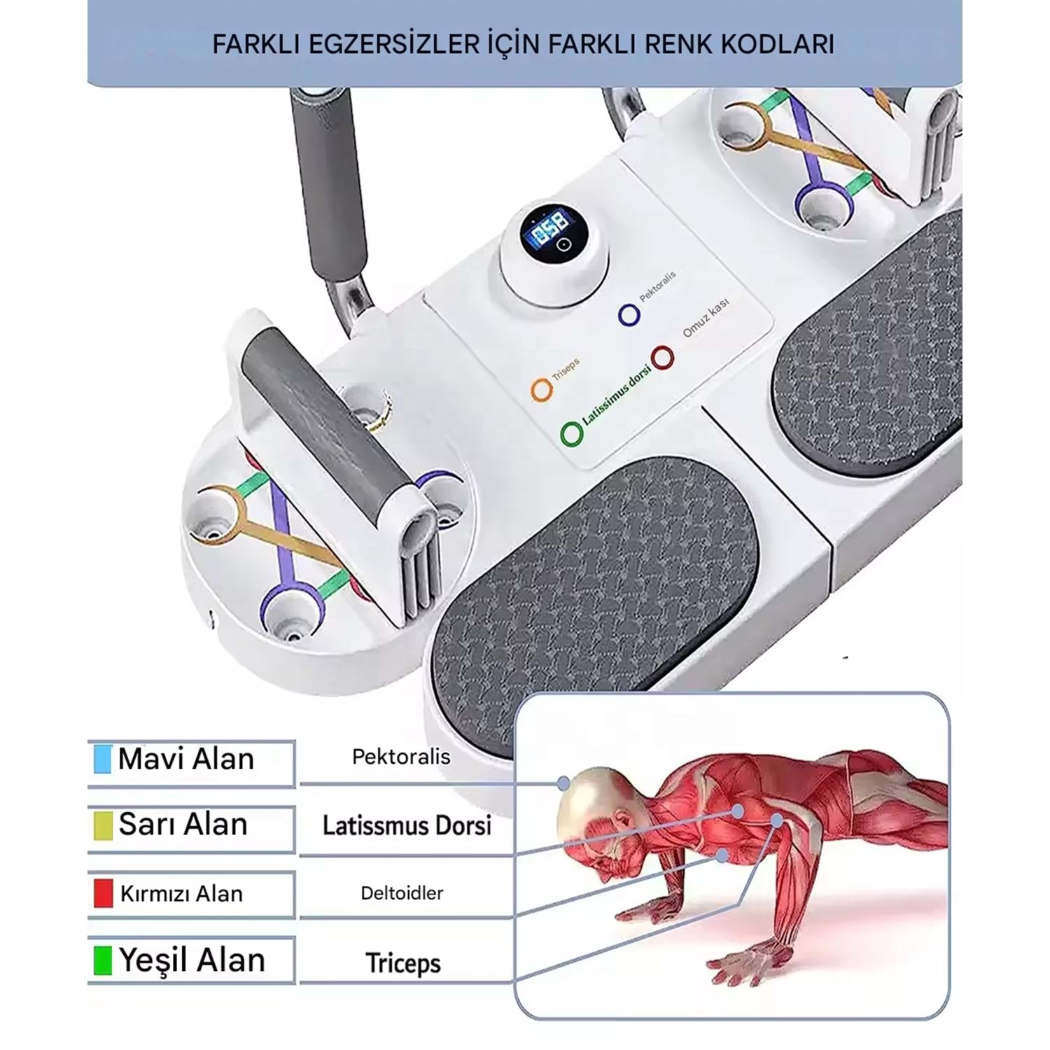 Ürün 3-ü-1 tasarıma sahiptir. Şınav, plank ve direnç bandı egzersizleri yapabilirsiniz. Renkli delik sistemi sayesinde omuz, göğüs, sırt ve triceps gibi farklı kas gruplarını hedefleyebilirsiniz.